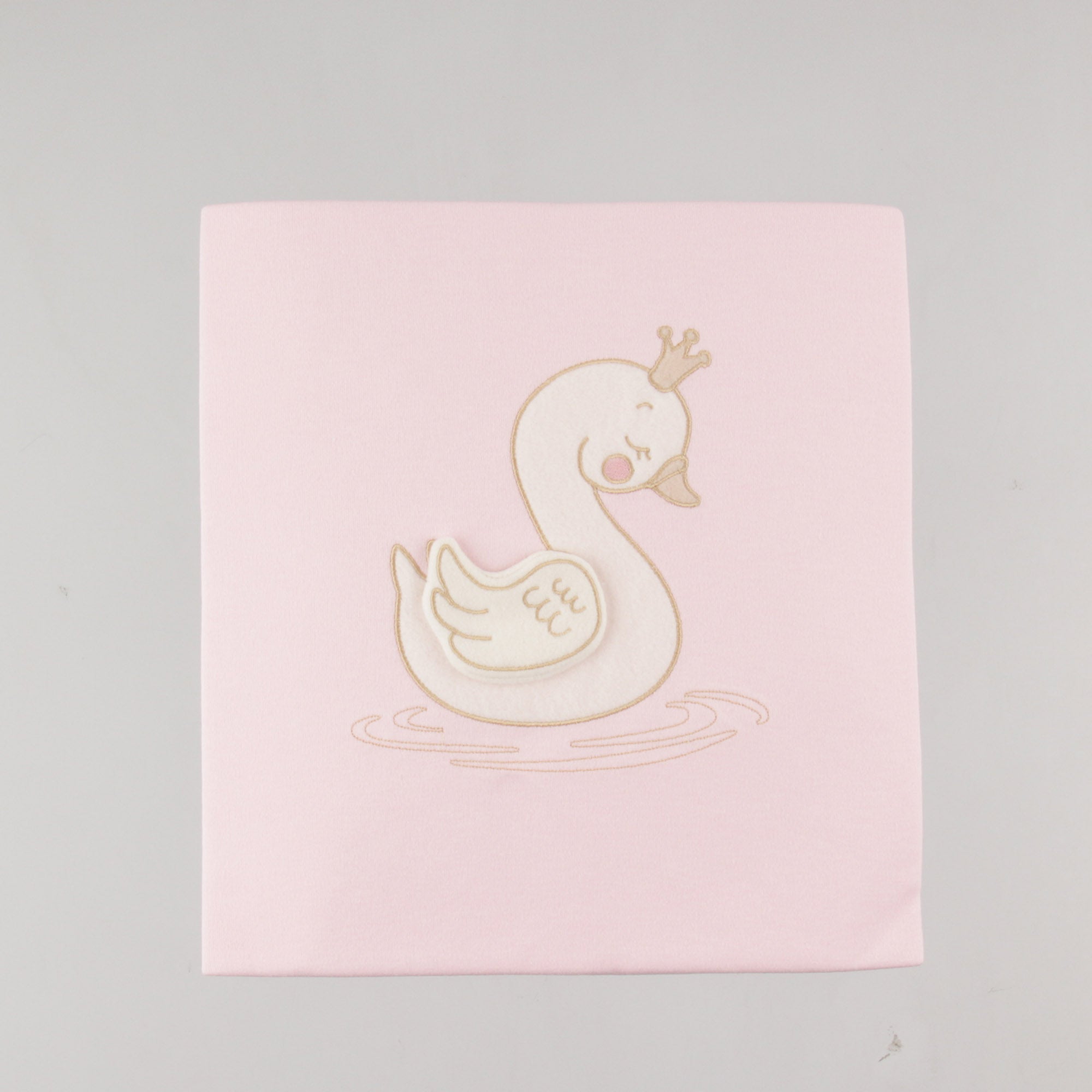 Елегантно и меко бебешко одеяло в нежен розов цвят, идеално за кошара, количка или като декоративен елемент в детската стая. Дизайнът с коронован лебед го прави чудесен избор за момиченце.