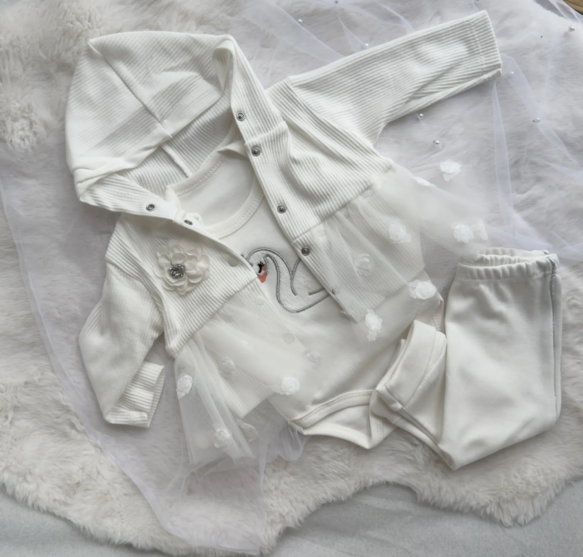 Описание: Изискан и елегантен комплект от 3 части, идеален за изписване от родилния дом, кръщене или първи официален повод. Комплектът съчетава класическия комфорт на памука с нежни, празнични детайли. Комплектът включва: Боди с Дълъг Ръкав: Дизайн: Меко боди, с тик-так копчета между крачетата. Акцент: Изящна бродерия на лебед (в сребристо/бяло)...
