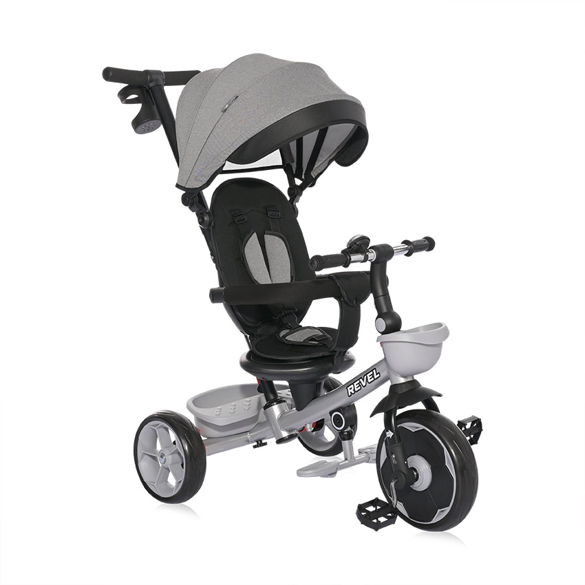 сгъваем сенник звънец мека седалка спирачки на задните колела тапицирана облегалка педали сгъваема поставка за крачета бутон за завъртане на седалката позиция: с гръб към родителя позиция: с лице към родителя позиция: родителски контрол пластмасова поставка за чаша или шише пластмасов багажник 2 позиции за регулация на височината на дръжката...