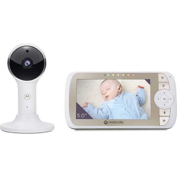 Видео бебефон Motorola VM65 има 5-инчов екран и камера с цифрово панорамиране, накланяне и мащабиране, която се свързва с приложение чрез Wi-Fi, за да активира HD 1080p видео и осигурява сигурна връзка.